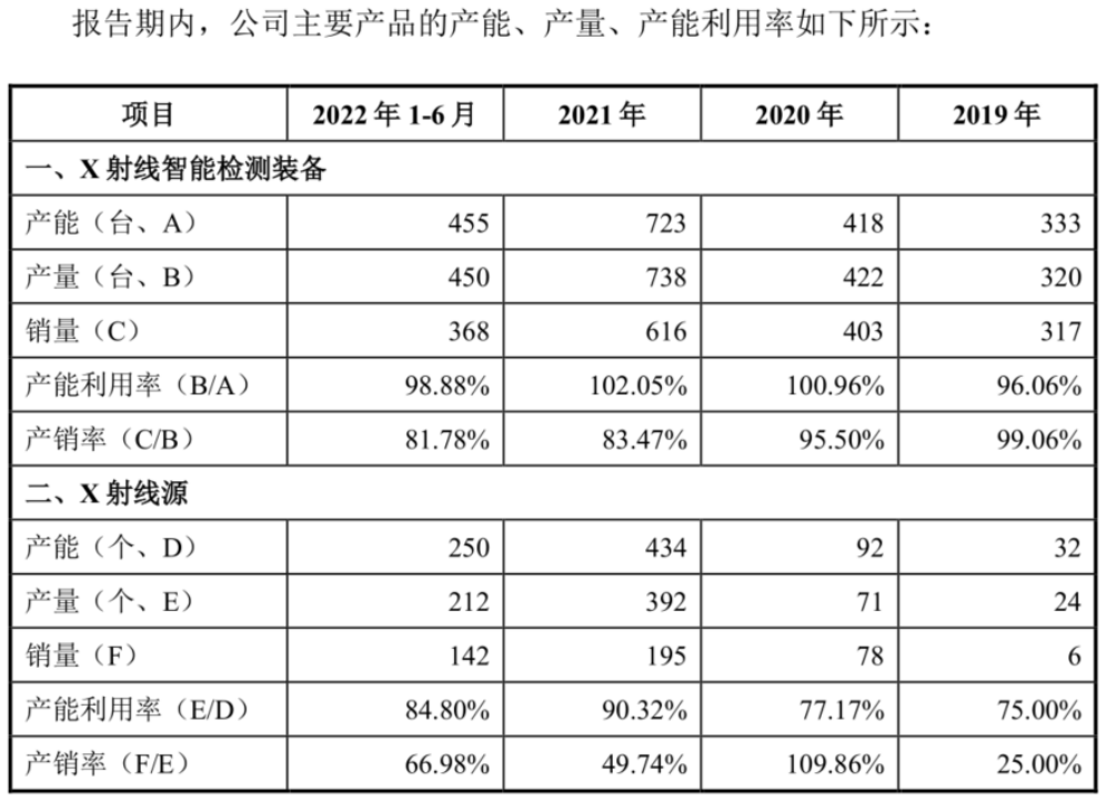 此背景下,公司2022年上半年在線型檢測設(shè)備生產(chǎn)周期延長約14天,毛利率水平和銷售設(shè)備數(shù)量均受到較大影響。招股數(shù)據(jù)同樣顯示,公司X射線智能檢測裝備產(chǎn)銷率已經(jīng)由2019年的99.06%大幅跌至2022上半年的81.78%,X射線源的產(chǎn)銷率也由2020年的109.86%跌至2022上半年的66.98%。