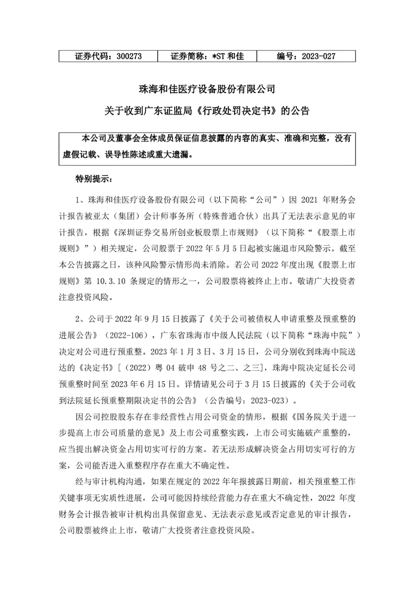 根據(jù)公告,因涉嫌信息披露違法違規(guī),*ST和佳于2022年12月7日收到中國證監(jiān)會立案告知書。3月28日,公司收到廣東證監(jiān)局送達(dá)的《行政處罰決定書》。