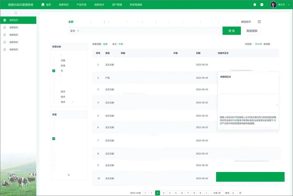 結(jié)合乳品研發(fā)業(yè)務(wù)的知識關(guān)鍵詞、分類、標(biāo)簽等多維度建立統(tǒng)一的知識搜索中心,貼近科研工作者使用偏好,滿足模糊查詢以及精準(zhǔn)定位的要求,并可根據(jù)業(yè)務(wù)標(biāo)簽的條件組合自動聚類,實現(xiàn)知識資源的穿透與關(guān)聯(lián),在業(yè)務(wù)中充分利用相關(guān)歷史知識資源。