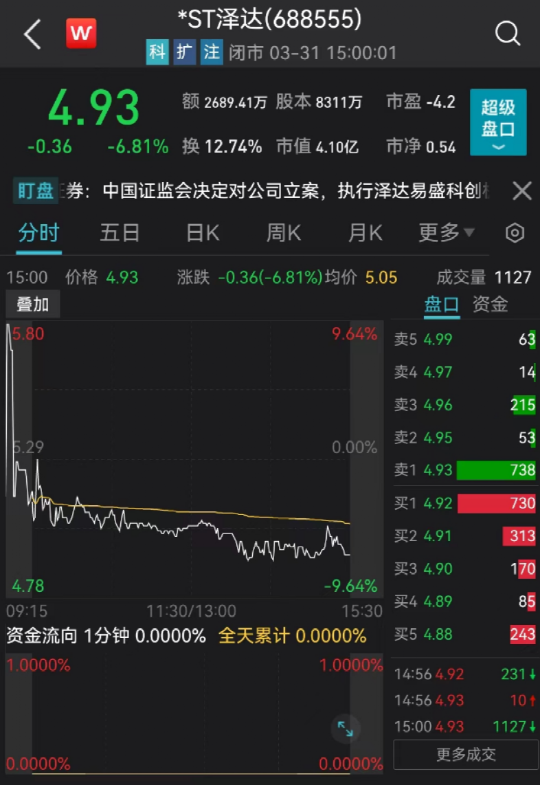 2020年6月,澤達(dá)易盛登陸科創(chuàng)板市場,上市初期股價曾達(dá)到85.56元/股的高位。此后,澤達(dá)易盛股價一路下行,在遭遇證監(jiān)會調(diào)查及下發(fā)行政處罰事先告知書等時期,更是連拉“20CM”跌停。至今,“披星戴帽”的*ST澤達(dá)總市值僅余4.1億元。