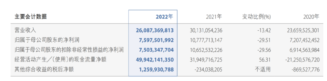 年報(bào)顯示,公司主營(yíng)收入260.87億元,歸母凈利潤(rùn)75.98億元,扣非凈利潤(rùn)75.03億元。
