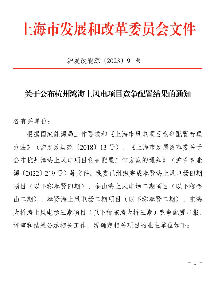 近日,上海市發(fā)改委公布了杭州灣海上風(fēng)電項(xiàng)目競爭配置結(jié)果。公司聯(lián)合體成功獲得奉賢海上風(fēng)電場四期項(xiàng)目(“奉賢四期”)、東海大橋海上風(fēng)電場三期項(xiàng)目(“東海大橋三期”)競爭性配置建設(shè)指標(biāo)。