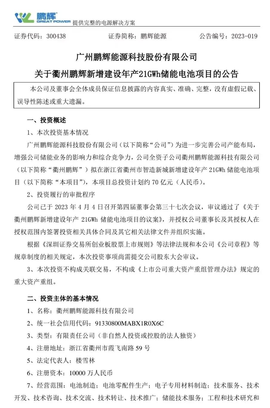 根據(jù)公告,當(dāng)天鵬輝能源召開第四屆董事會第三十七次會議,審議通過了《關(guān)于衢州鵬輝新增建設(shè)年產(chǎn)21GWh儲能電池項目的議案》。為進一步完善公司產(chǎn)能布局,增強公司儲能業(yè)務(wù)的影響力和綜合競爭力,公司全資子公司衢州鵬輝能源科技有限公司擬在浙江省衢州市智造新城新增建設(shè)年產(chǎn)21GWh儲能電池項目。