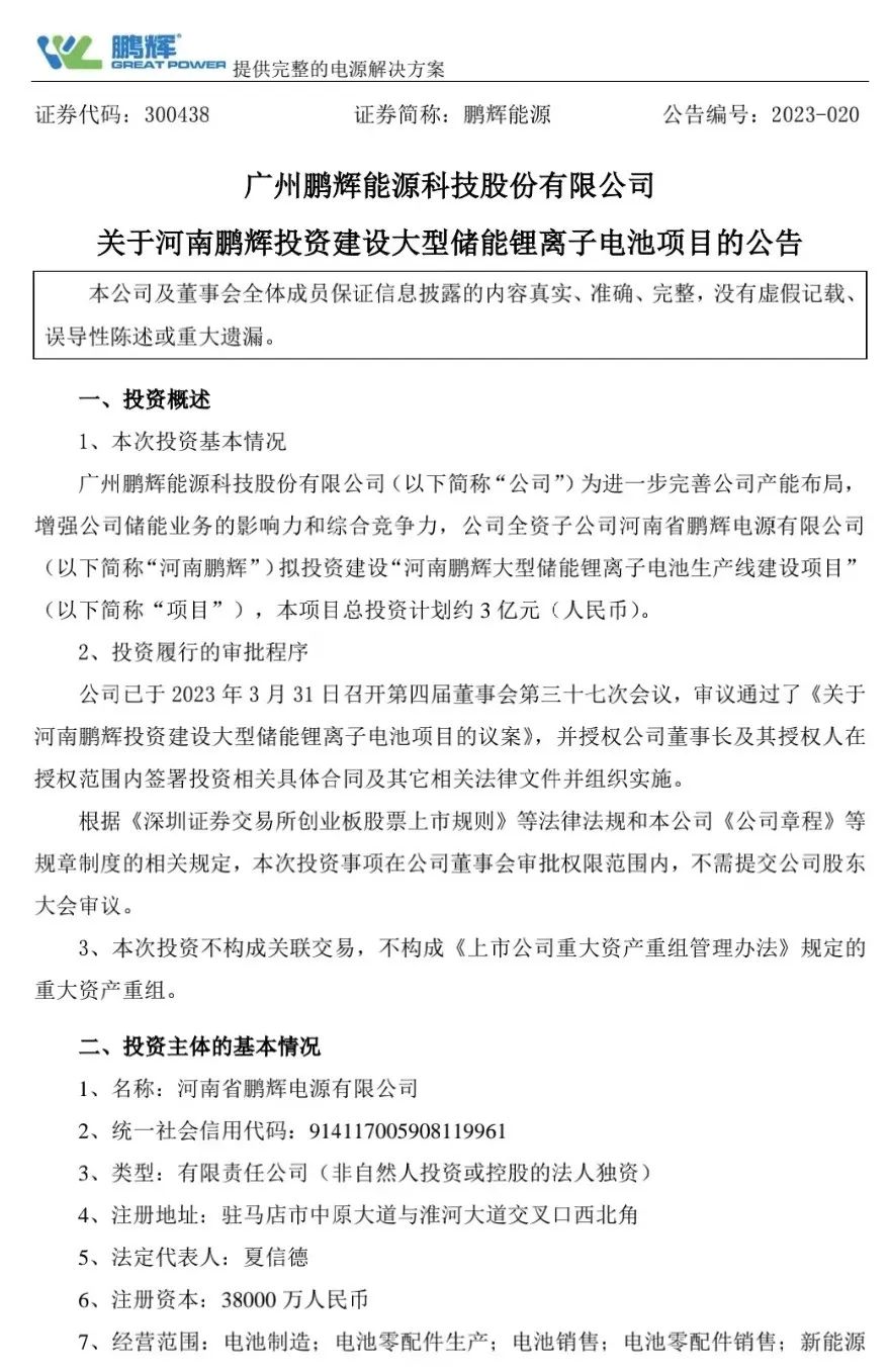 當(dāng)天,鵬輝能源董事會會議還審議通過了《關(guān)于河南鵬輝投資建設(shè)大型儲能鋰離子電池項目的議案》。為進一步完善公司產(chǎn)能布局,公司全資子公司河南省鵬輝電源有限公司擬投資建設(shè)河南鵬輝大型儲能鋰離子電池生產(chǎn)線建設(shè)項目。