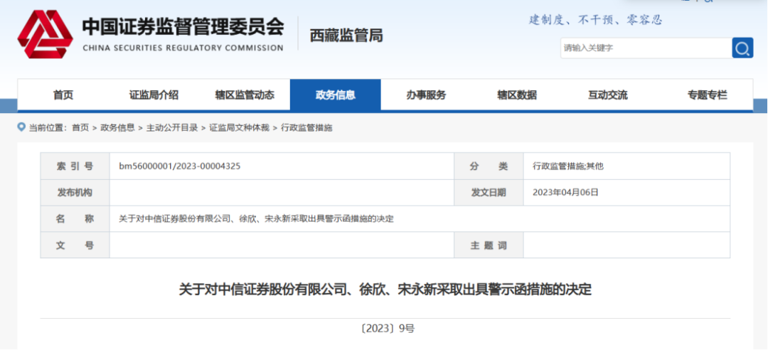 4月6日,證監(jiān)會(huì)官網(wǎng)信息顯示,西藏證監(jiān)局對(duì)中信證券(600030)及兩名保薦代表人采取出具警示函的決定。