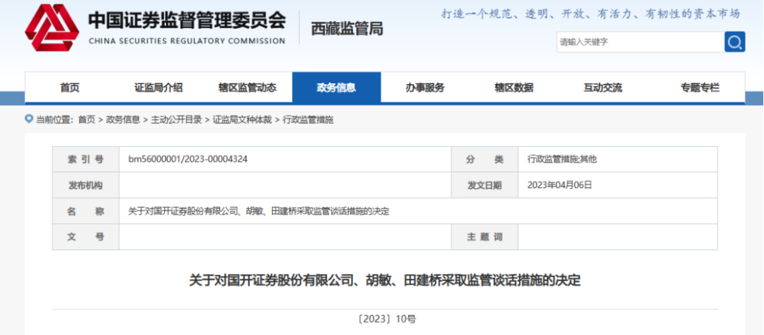 對(duì)此,西藏證監(jiān)局對(duì)國(guó)開證券及兩名保薦代表人采取監(jiān)管談話的行政監(jiān)督管理措施。要求其攜帶有效身份證件到西藏證監(jiān)局接受監(jiān)管談話。