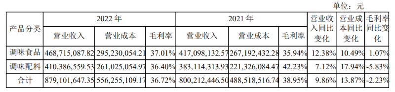 2022年,仲景食品分產(chǎn)品的營業(yè)收入、成本、毛利情況