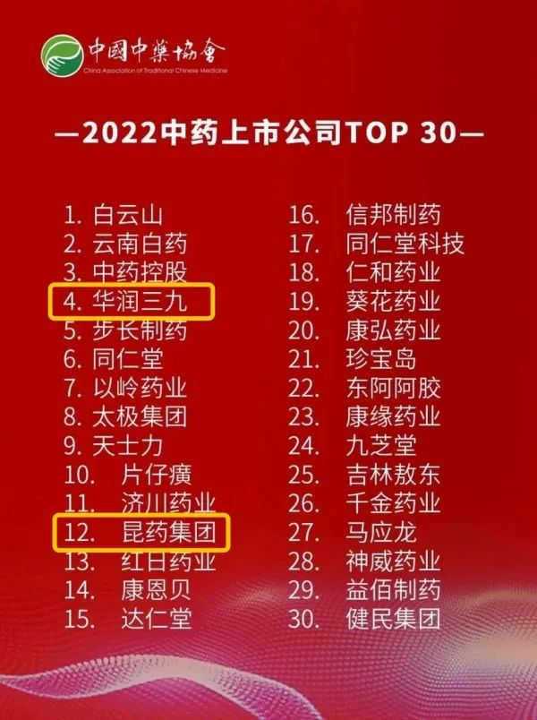 近日,由中國(guó)中藥協(xié)會(huì)主辦的“第三屆中國(guó)中藥品牌建設(shè)大會(huì)”在北京召開(kāi),華潤(rùn)三九(000999)和昆藥集團(tuán)(600422)均榮列“2022中藥上市公司TOP30”榜單。