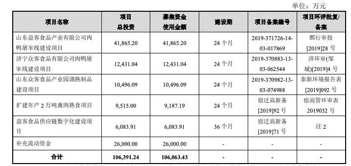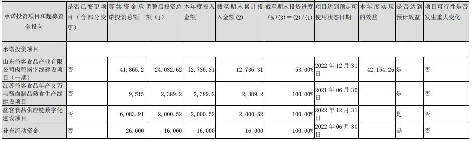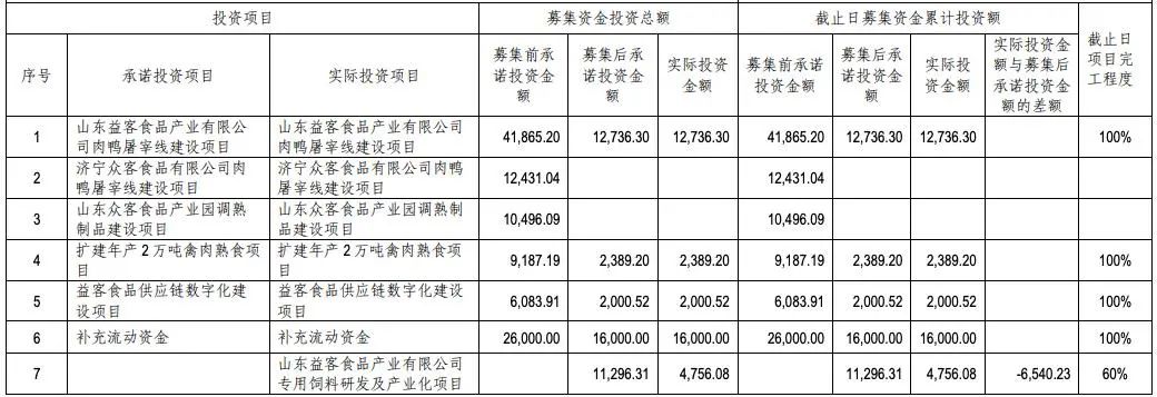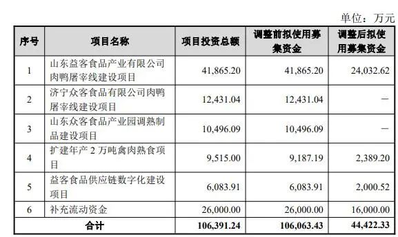 回顧彼時IPO,益客食品原計劃募資10.64億元,用于“山東益客食品產(chǎn)業(yè)有限公司肉鴨屠宰線建設項目”(以下簡稱為“屠宰項目”)“濟寧眾客食品有限公司肉鴨屠宰線建設項目”(后暫緩投入)“山東眾客食品產(chǎn)業(yè)園調(diào)熟制品建設項目”(后暫緩投入)“擴建年產(chǎn)2萬噸禽肉熟食項目”(以下簡稱為“熟食項目”)“益客食品供應鏈數(shù)字化建設項目”(以下簡稱為“數(shù)字化項目”)以及補充流動資金。