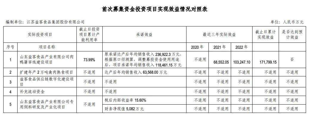 至于唯一產(chǎn)生效益的屠宰項目,根據(jù)披露,該項目調(diào)整后承諾達產(chǎn)后年均銷售收入11.85億元,而在實際經(jīng)營中,該項目分別于2021年、2022年實現(xiàn)年銷售收入6.86億元、10.32億元,截至2022年底累計實現(xiàn)效益17.18億元、產(chǎn)能利用率73.99%。