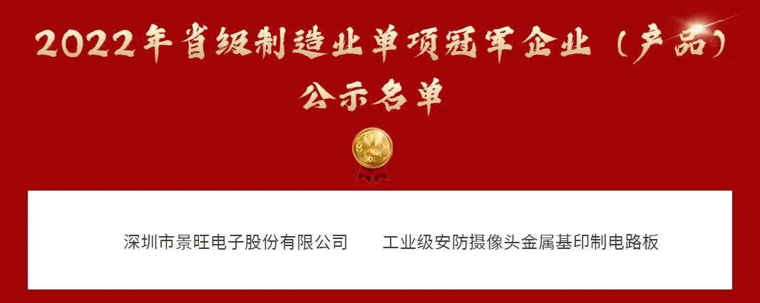 近日,廣東省工業(yè)和信息化廳公示了2022年省級制造業(yè)單項冠軍企業(yè)(產(chǎn)品)名單,景旺電子(603228)“工業(yè)級安防攝像頭金屬基印制電路板”榮獲“省級制造業(yè)單項冠軍產(chǎn)品”稱號。