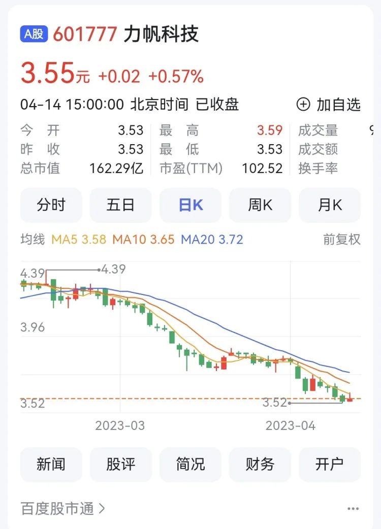 4月14日,力帆科技報(bào)收3.55元,漲0.57%,換手率0.22%,總市值162.29億元。