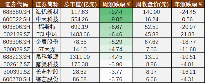 本周股價周跌幅居前的十家A股光伏公司 制圖: