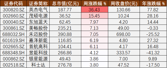 其中,英杰電氣(300820)(300820.SZ)、茂碩電源(002660)(002660.SZ)、東旭藍天(000040)(000040.SZ)在板塊內(nèi)領(lǐng)漲,周漲幅為36.43%、15.45%、7.97%。