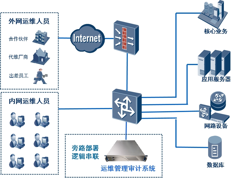 結(jié)合ITIL、ITSM、IT 內(nèi)控、SOX法案COBIT 法規(guī)、信息安全等級保護、密評合規(guī)性及IT運維管理要求,專注于網(wǎng)絡(luò)信息安全領(lǐng)域的吉大正元,綜合多年IT運維管理建設(shè)經(jīng)驗和業(yè)界信息安全建設(shè)的基礎(chǔ)上,在不更改原有網(wǎng)絡(luò)拓撲結(jié)構(gòu)、不影響服務(wù)器的業(yè)務(wù)數(shù)據(jù)流、不需要在被保護服務(wù)器和終端上安裝任何Agent的情況下,滿足用戶對企業(yè)“人機”交互、企業(yè)“應(yīng)用”交付的集中管理、集中認證、集中控制、集中審計等一系列安全需求。