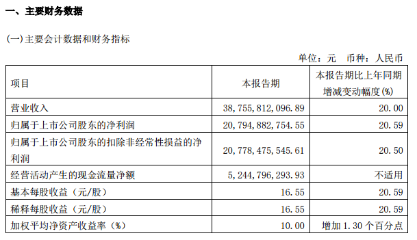 此前,在4月中旬,貴州茅臺(tái)曾發(fā)布過(guò)最新季度經(jīng)營(yíng)數(shù)據(jù),當(dāng)時(shí),經(jīng)公司初步核算,2023年第一季度,公司實(shí)現(xiàn)營(yíng)業(yè)總收入391.6億元左右,同比增長(zhǎng)18%左右;實(shí)現(xiàn)凈利潤(rùn)205.2億元左右,同比增長(zhǎng)19%左右。