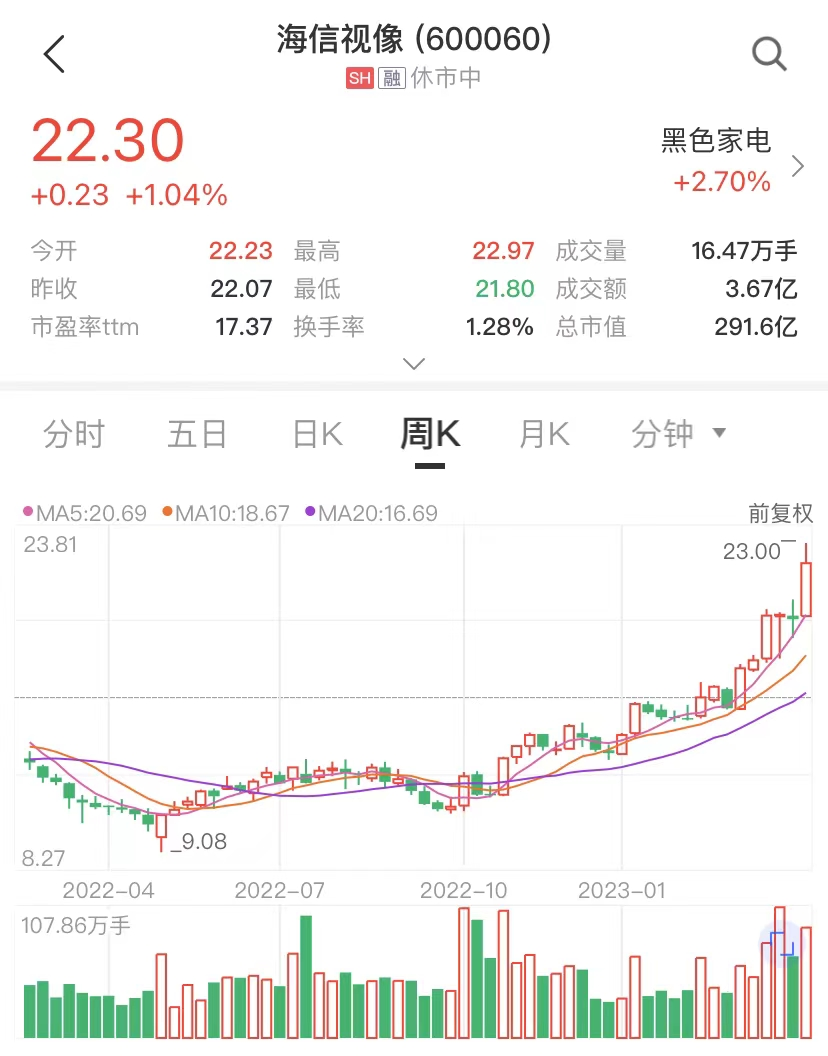 股價(jià)方面,海信視像自去年4月27日創(chuàng)出階段性低點(diǎn)9.05元以來(lái),截至今年4月28日收盤,股價(jià)報(bào)22.3元/股,一年來(lái)漲幅高達(dá)146%。業(yè)內(nèi)人士分析,海信視像亮眼業(yè)績(jī)的背后,得益于公司全場(chǎng)景顯示戰(zhàn)略的布局升級(jí),特別是高端化、全球化的加速推進(jìn)。