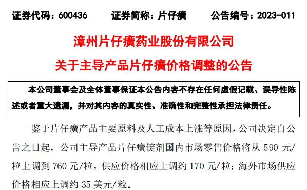 5月5日晚間,A股中藥巨頭片仔癀(600436)發(fā)布關(guān)于主導(dǎo)產(chǎn)品片仔癀價(jià)格調(diào)整的公告。公告顯示,鑒于片仔癀產(chǎn)品主要原料及人工成本上漲等原因,公司決定自公告之日起,公司主導(dǎo)產(chǎn)品片仔癀錠劑國(guó)內(nèi)市場(chǎng)零售價(jià)格將從590元/粒上調(diào)到760元/粒,供應(yīng)價(jià)格相應(yīng)上調(diào)約170元/粒;海外市場(chǎng)供應(yīng)價(jià)格相應(yīng)上調(diào)約35美元/粒。