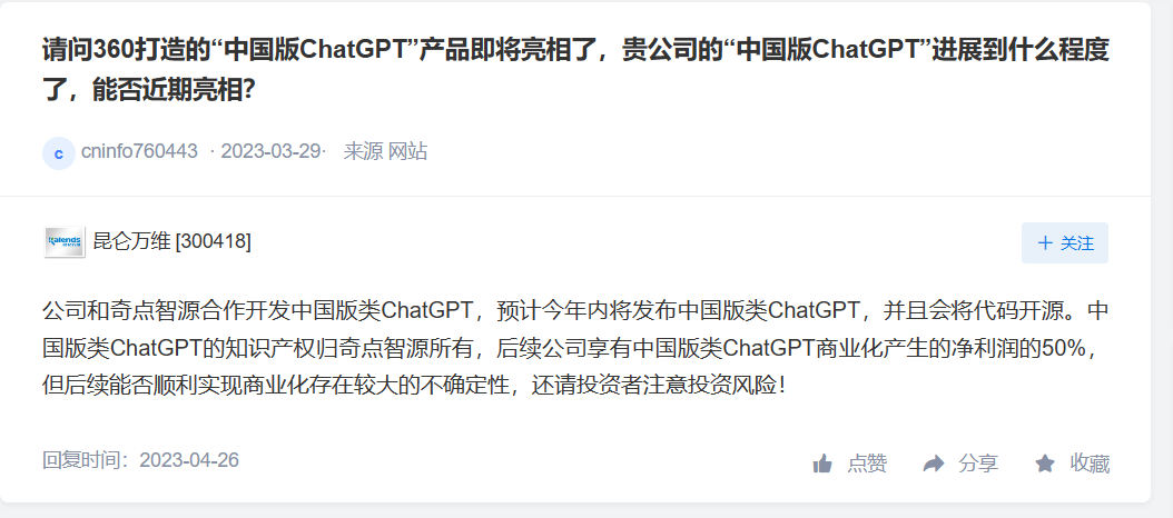 請(qǐng)問 360 打造的“中國版 ChatGPT”產(chǎn)品即將亮相了,貴公司的“中國版 ChatGPT”進(jìn)展到什么程度了,能否近期亮相?