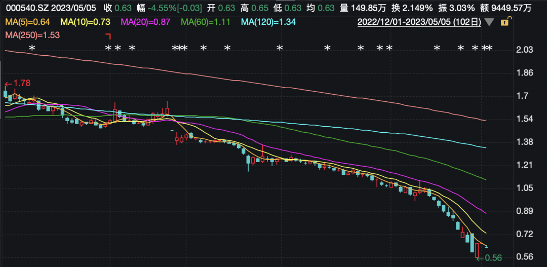 5月5日,復(fù)牌交易的首個(gè)交易日,*ST中天(000540)股價(jià)收盤跌停,報(bào)0.63元,已連續(xù)11個(gè)交易日跌破股票面值。據(jù)記者測(cè)算,即使未來9個(gè)交易日,公司股價(jià)每天都以漲停價(jià)收盤,仍無法在第20個(gè)交易日站上1元,由此也觸及“1元退市”情形。