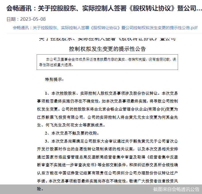 5月7日晚間,會(huì)暢通訊一紙公告宣布公司控制權(quán)將發(fā)生變更。