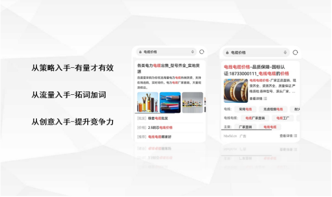 起帆電纜的產(chǎn)品擁有30多個(gè)系列、上萬(wàn)種規(guī)格,客戶(hù)更是涵蓋石油、化工、建筑等領(lǐng)域客戶(hù)。服務(wù)對(duì)象不同,需求也各有特色。360搜索鳳舞廣告通過(guò)關(guān)鍵詞匹配技術(shù),定位目標(biāo)客群,展現(xiàn)樣式豐富新穎。鳳舞櫥窗、導(dǎo)航、文字子鏈、圖片子鏈、電話直呼按鈕……智能組件可以靈活拼接,針對(duì)起帆電纜的不同產(chǎn)品、不同行業(yè)客戶(hù)實(shí)現(xiàn)差異化的營(yíng)銷(xiāo)展現(xiàn)。
