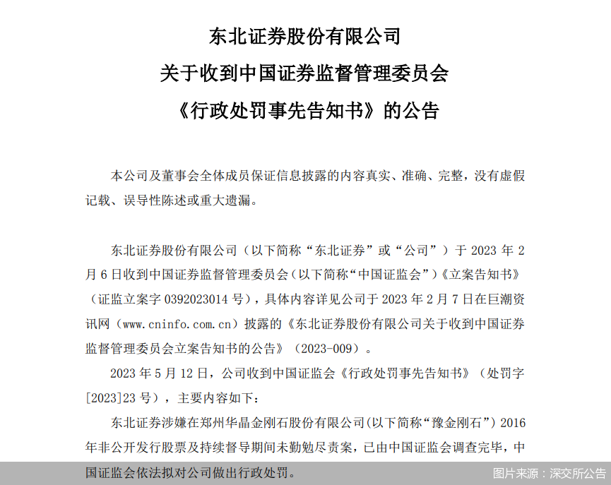 7年舊案被翻出,東北證券難逃其咎。5月14日,東北證券發(fā)布公告表示,5月12日,公司收到中國(guó)證監(jiān)會(huì)《行政處罰事先告知書》,指出東北證券涉嫌在豫金剛石2016年非公開發(fā)行股票及持續(xù)督導(dǎo)期間未勤勉盡責(zé)案,證監(jiān)會(huì)依法擬對(duì)東北證券做出行政處罰。