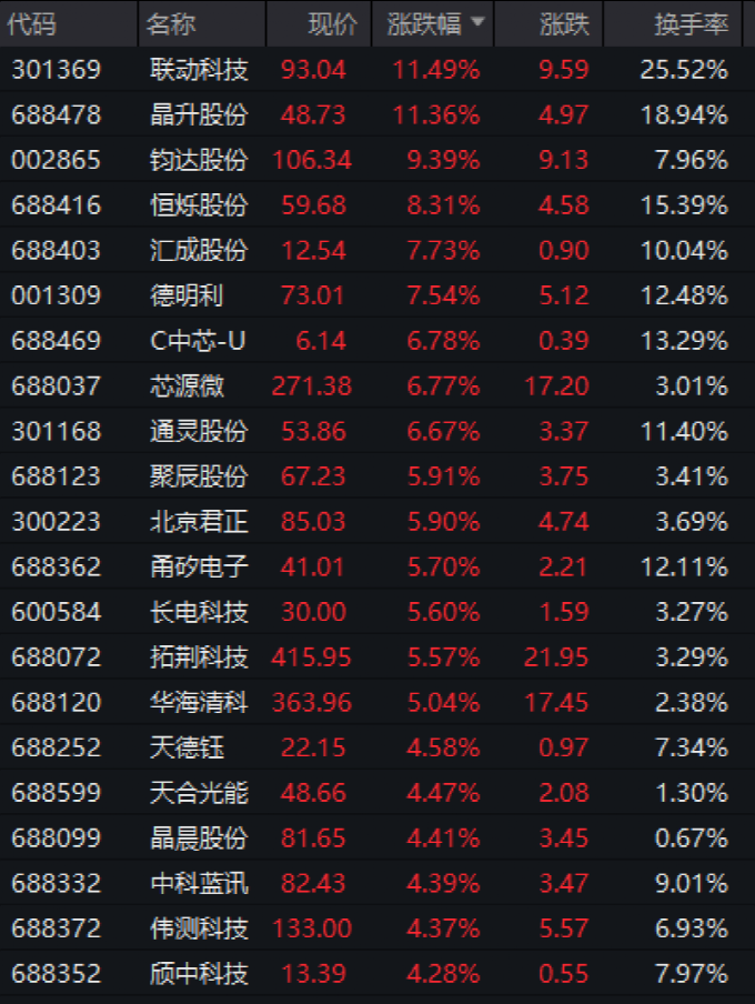 此外,芯片、半導體板塊震蕩反彈,存儲芯片方向領(lǐng)漲。聯(lián)動科技(301369)、晶升股份漲超11%,鈞達股份(002865)、匯成股份等均漲超7%。