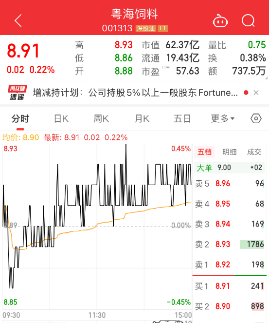 Fortune Magic Investment Limited持有的股份今年2月剛剛解禁,按照粵海飼料最新收盤價8.91元計算,擬減倉市值8.88億元,接近9億元。