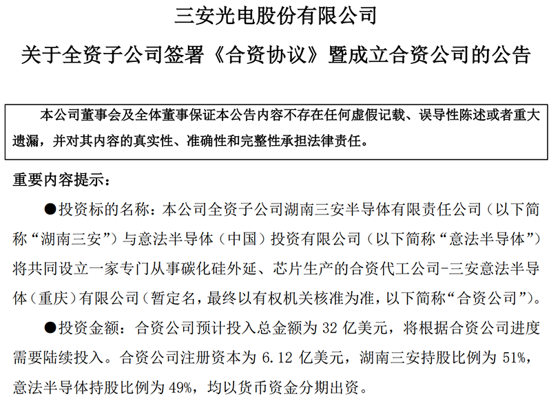 根據(jù)公告,該合資項(xiàng)目公司暫定名為“三安意法半導(dǎo)體(重慶)有限公司”,注冊(cè)資本6.12億美元,其中由三安光電全資子公司湖南三安持股51%,意法半導(dǎo)體(中國(guó))投資有限公司持股49%(均以貨幣資金分期出資)。項(xiàng)目預(yù)計(jì)投資總額達(dá)32億美元,在取得各項(xiàng)手續(xù)批復(fù)后開始建設(shè),計(jì)劃于2025年完成階段性建設(shè)并逐步投產(chǎn),2028年達(dá)產(chǎn),規(guī)劃達(dá)產(chǎn)后生產(chǎn)8英寸碳化硅晶圓10000片/周。