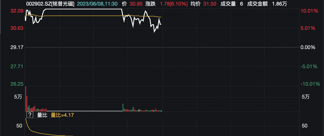 6月8日,銘普光磁早盤再次漲停,不過(guò)臨近午間收盤打開漲停板,截至午間收盤,漲6.10%,報(bào)30.95元/股。