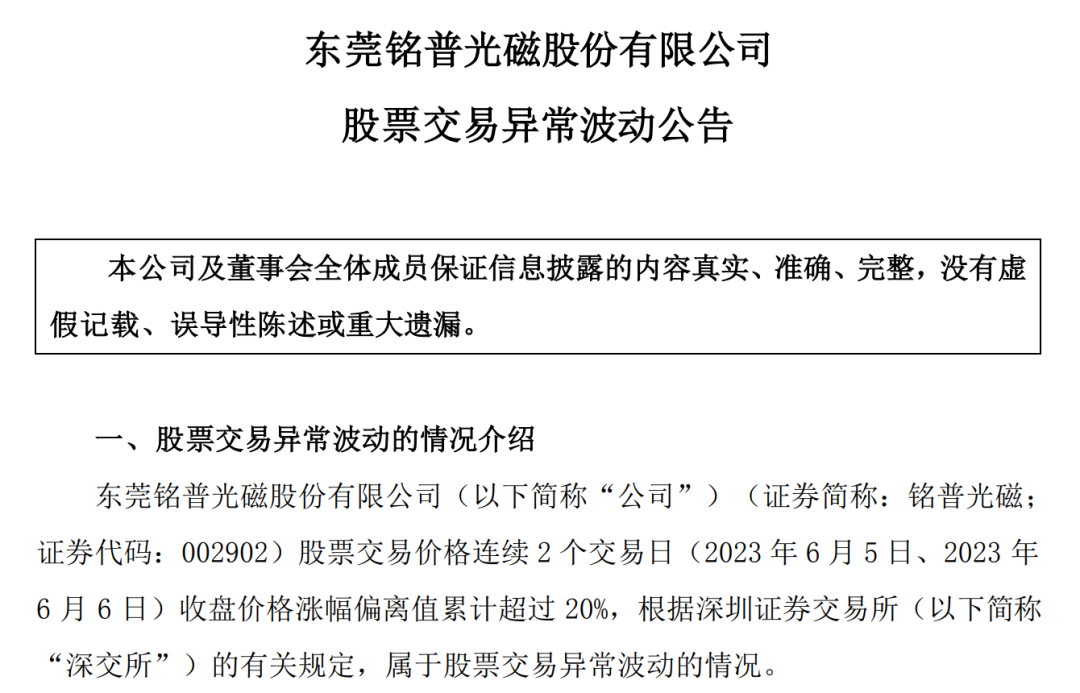 6月6日晚,銘普光磁曾發(fā)布股票交易異常波動(dòng)公告稱,公司未發(fā)現(xiàn)近期公共傳媒報(bào)道了可能或已經(jīng)對(duì)公司股票交易價(jià)格產(chǎn)生較大影響的未公開重大信息;公司已披露的經(jīng)營(yíng)情況、內(nèi)外部經(jīng)營(yíng)環(huán)境未發(fā)生重大變化;公司、控股股東和實(shí)際控制人不存在關(guān)于公司的應(yīng)披露而未披露的重大事項(xiàng)。