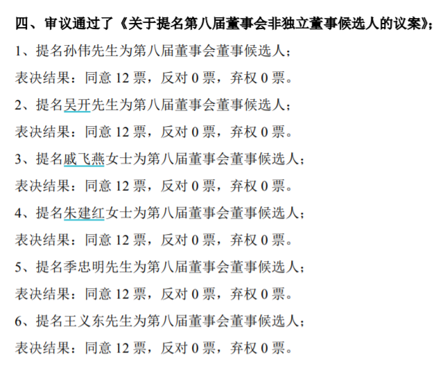 該行新一任董事會成員也浮出水面。公告顯示,公司審議通過了提名孫偉、吳開、戚飛燕、朱建紅、季忠明、王義東、陳建興7人,組成第八屆董事會董事候選人;同意提名上述7人為公司新董事會非獨(dú)董候選人,任期3年,自監(jiān)管機(jī)構(gòu)核準(zhǔn)之日起計(jì)算。