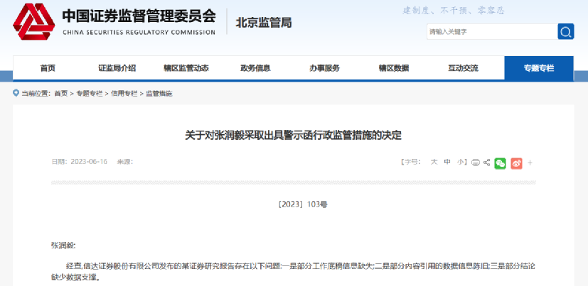 根據(jù)《發(fā)布證券研究報告暫行規(guī)定》,制作證券研究報告應(yīng)當(dāng)合規(guī)、客觀、專業(yè)、審慎。署名的證券分析師應(yīng)當(dāng)對證券研究報告的內(nèi)容和觀點負(fù)責(zé),保證信息來源合法合規(guī),研究方法專業(yè)審慎,分析結(jié)論具有合理依據(jù)。基于此,北京證監(jiān)局決定對張潤毅采取出具警示函的行政監(jiān)管措施。
