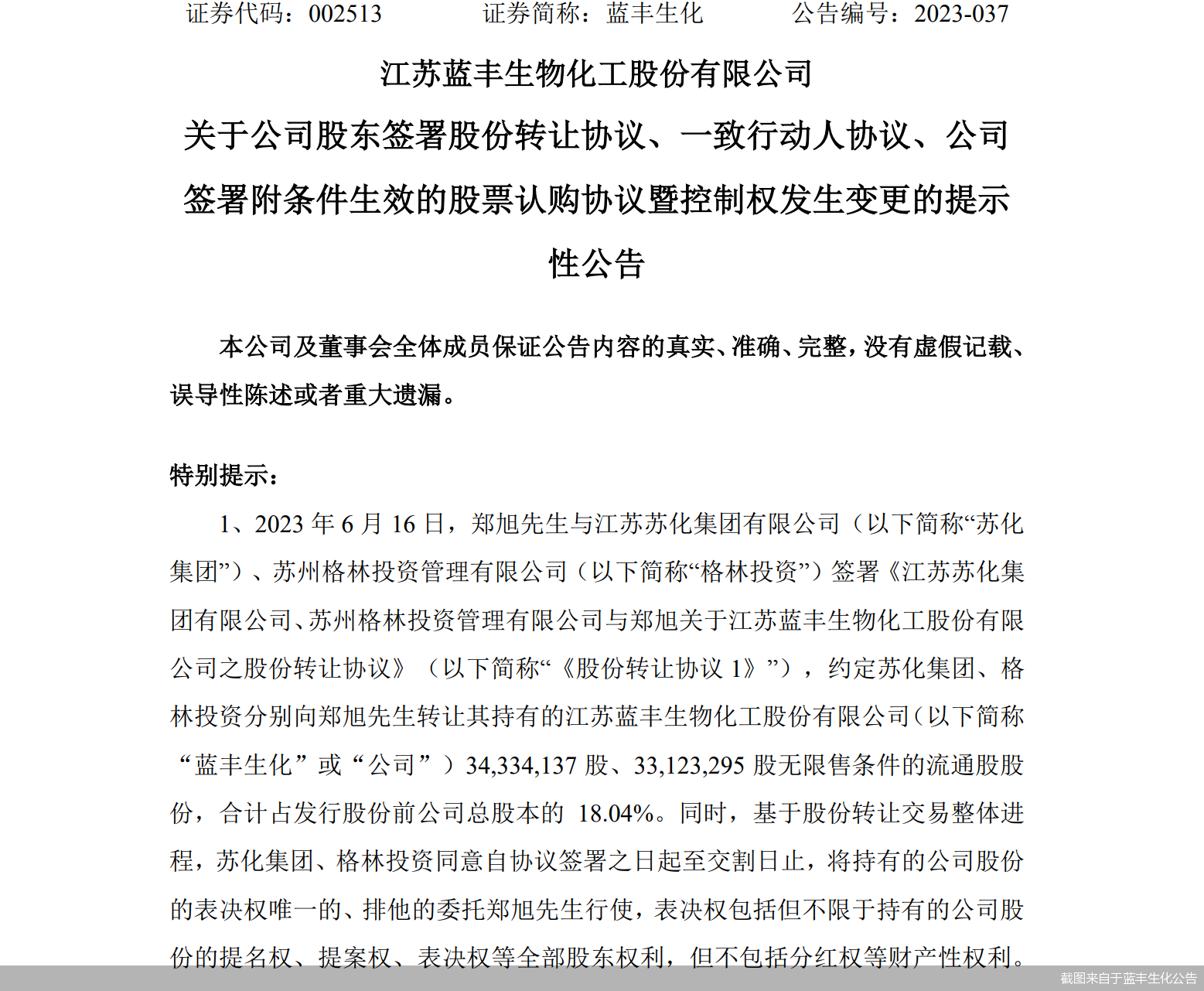 藍(lán)豐生化公告顯示,6月16日,鄭旭與江蘇蘇化集團(tuán)有限公司(以下簡稱“蘇化集團(tuán)”)、蘇州格林投資管理有限公司(以下簡稱“格林投資”)簽署《股份轉(zhuǎn)讓協(xié)議》,約定蘇化集團(tuán)、格林投資分別向鄭旭轉(zhuǎn)讓其持有的藍(lán)豐生化3433.41萬股、3312.33萬股無限售條件的流通股股份,合計占公司總股本的18.04%,交易價格約為2.97億元。同時,蘇化集團(tuán)、格林投資同意將持有的公司股份的表決權(quán)委托鄭旭行使。