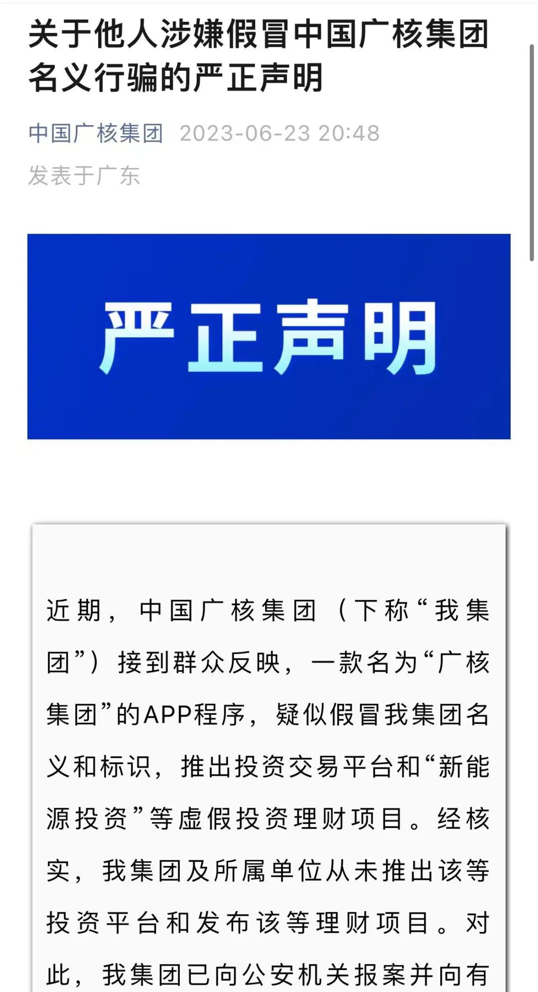 6月23日晚間,據(jù)“中國廣核(003816)集團(tuán)”微信公眾號消息,中國廣核集團(tuán)發(fā)布嚴(yán)正聲明:“近期,中國廣核集團(tuán)接到群眾反映,一款名為‘廣核集團(tuán)’的APP程序,疑似假冒我集團(tuán)名義和標(biāo)識,推出投資交易平臺和‘新能源投資’等虛假投資理財(cái)項(xiàng)目。經(jīng)核實(shí),我集團(tuán)及所屬單位從未推出該等投資平臺和發(fā)布該等理財(cái)項(xiàng)目。對此,我集團(tuán)已向公安機(jī)關(guān)報(bào)案并向有關(guān)行政機(jī)關(guān)舉報(bào)。”