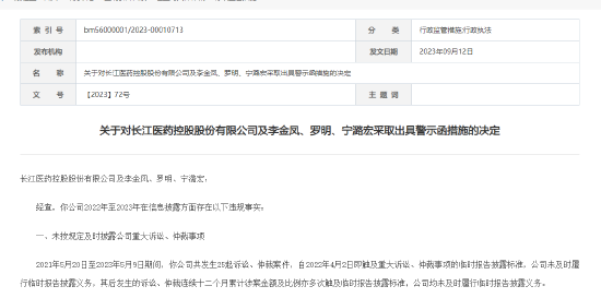近日,山東證監(jiān)局披露了《關(guān)于對(duì)長江醫(yī)藥控股股份有限公司及李金鳳、羅明、寧潞宏采取出具警示函措施的決定》的公告。
