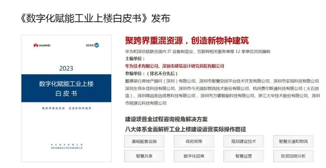 9月20日下午,華為全聯(lián)接大會(huì)“數(shù)智賦能”專題演講環(huán)節(jié),今天國際(300532)參編的《2023數(shù)字化賦能工業(yè)上樓白皮書》(以下簡(jiǎn)稱“白皮書”)正式發(fā)布。本白皮書由華為技術(shù)有限公司和深圳市建筑設(shè)計(jì)研究總院有限公司聯(lián)合今天國際等多家 單位共同完成,今天國際作為主要參編單位,負(fù)責(zé)智慧交通解決方案和智慧物流解決方案章節(jié)內(nèi)容的編寫。本白皮書重點(diǎn)圍繞產(chǎn)業(yè)空間日趨緊張的超大型城市工業(yè)發(fā)展需求,提供“工業(yè)上樓”的新思路和新方案,打造城市工業(yè)化再升級(jí)的新物種。