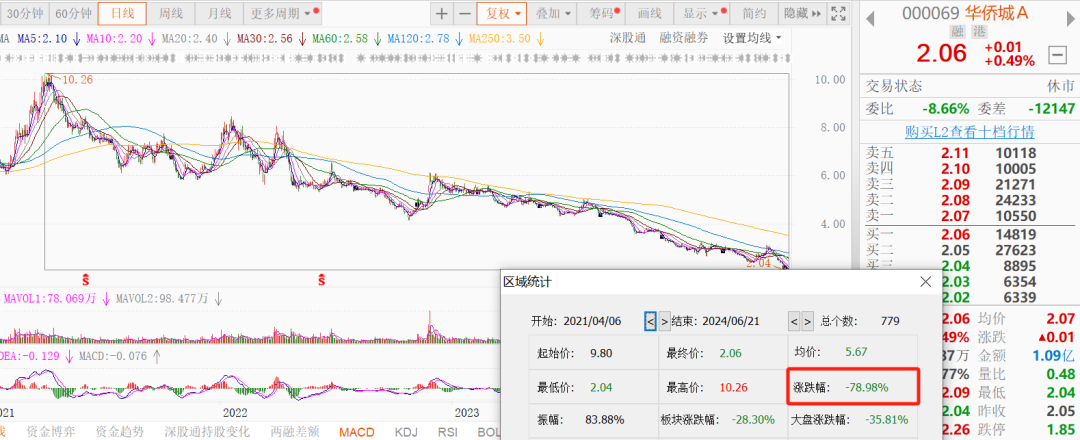 今年以來(lái),華僑城A股價(jià)大幅下行。截至6月21日,收盤(pán)價(jià)報(bào)2.06元/股,總市值跌至165.6億元。