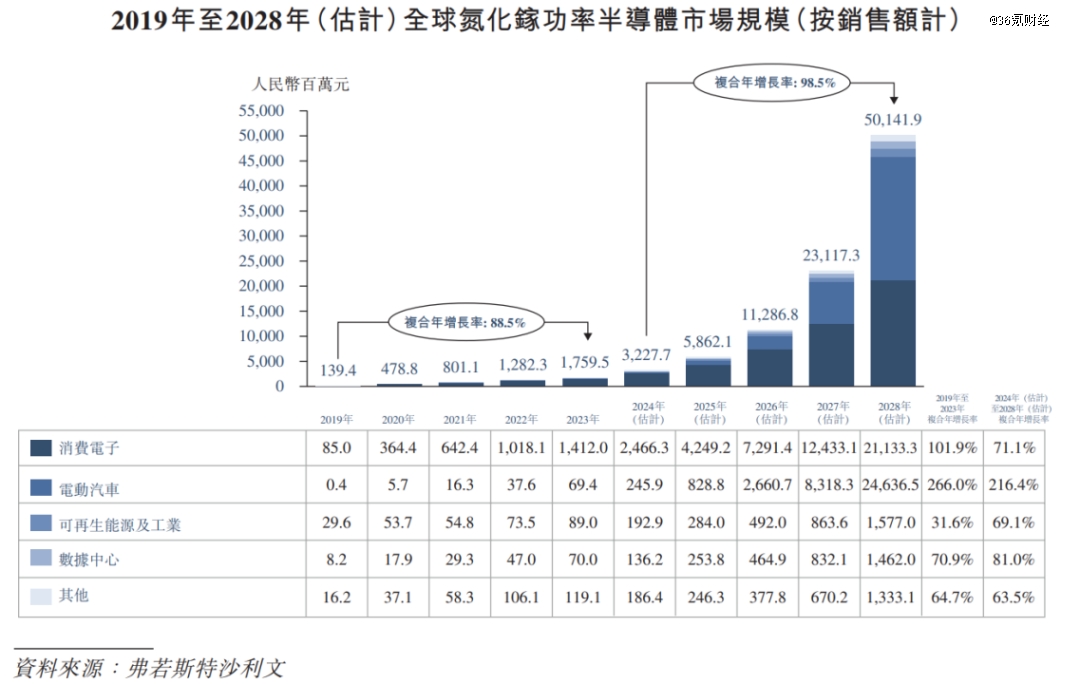 在招股說明書中,英諾賽科委托弗若斯特沙利文對氮化鎵未來的市場空間進(jìn)行了測算,其指出,氮化鎵功率半導(dǎo)體的市場規(guī)模將會(huì)從2023年的17.6億元增長27倍至2028年的501.42億元,2023-2028的復(fù)合增長率達(dá)到95%,從市場滲透率的角度看,氮化鎵在整個(gè)功率半導(dǎo)體行業(yè)中的滲透率將會(huì)從2023年的0.5%提升至2028年的10.1%。