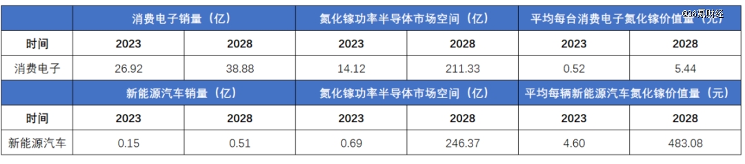 弗若斯特沙利文大概給出了市場空間的測算邏輯,就消費(fèi)電子而言,其指出2023—2028年,消費(fèi)電子累計(jì)銷量將從26.92億臺(tái)提升至38.88億臺(tái),如果按平均每臺(tái)消費(fèi)電子產(chǎn)品的氮化鎵價(jià)值量來看,將會(huì)從約0.52元/臺(tái),提升至約5.43元/臺(tái),這相當(dāng)于平均每個(gè)消費(fèi)電子產(chǎn)品都將會(huì)配置一個(gè)高功率的氮化鎵充電器。
