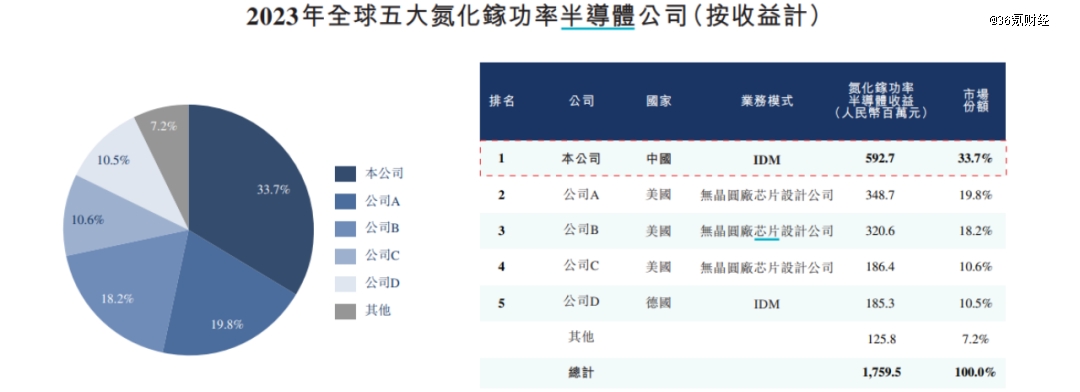 2021—2023年,英諾賽科的營業(yè)收入分別為0.68億元、1.36億元和5.93億元,根據(jù)英諾賽科招股說明書披露,按營收口徑,英諾賽科2023年在氮化鎵功率半導(dǎo)體的市場份額約為33.7%,前五大市場份額合計(jì)92.8%。按氮化鎵分立器件數(shù)量折算,英諾賽科2023年以來累計(jì)出貨量超5億顆,市占率42.4%。
