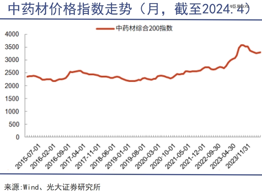 中藥材綜合200指數(shù)從2021年開始就維持著高位,2023年之后的走勢雖然經(jīng)歷了沖高回落,但目前指數(shù)仍收于3200點之上,遠高于疫情前的2500點,并且顯現(xiàn)出“淡季不淡”的反常特征。