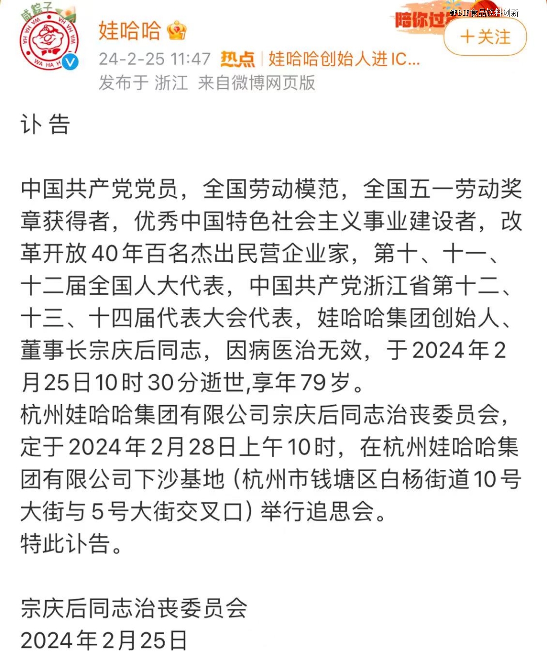 2024年2月25日11點,娃哈哈發(fā)布訃告:娃哈哈創(chuàng)始人、董事長宗慶后同志,因病醫(yī)治無效,于2024年2月25日10時30分逝世,享年79歲。