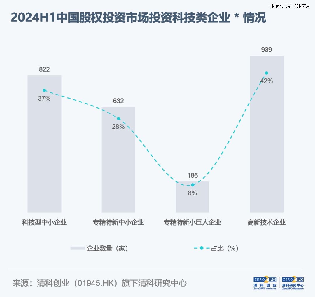 注:*本報(bào)告統(tǒng)計(jì)的科技類企業(yè)僅包括VC/PE直接投資企業(yè)是科技型中小企業(yè)、“專精特新”中小企業(yè)、專精特新“小巨人”企業(yè)、高新技術(shù)企業(yè),未覆蓋全部科技企業(yè);同時(shí),凡獲得過四類資質(zhì)認(rèn)定之一的企業(yè)均納入統(tǒng)計(jì)范圍,故存在同一企業(yè)獲得兩類及以上資質(zhì)認(rèn)定,或企業(yè)資質(zhì)已到期、稱號已自動(dòng)取消的情況,敬請注意。