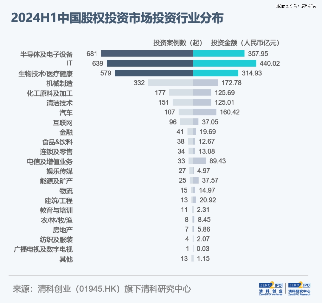 2024年上半年,科技產(chǎn)業(yè)仍然是重要投資主題,AI熱潮下IT領(lǐng)域投資關(guān)注度提升。根據(jù)清科研究中心統(tǒng)計(jì),半導(dǎo)體及電子設(shè)備、IT、生物技術(shù)/醫(yī)療健康、機(jī)械制造、化工原料及加工五大行業(yè)共發(fā)生投資案例數(shù)2,408起,占比79.4%,同比增加1.9個(gè)百分點(diǎn)。