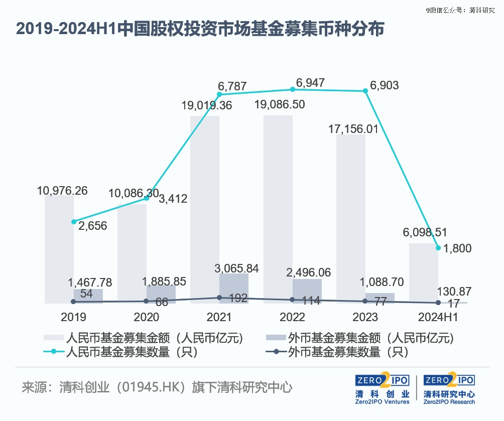 人民幣基金數(shù)量降幅超過外幣基金,外幣基金募資規(guī)模僅為去年同期的1/3